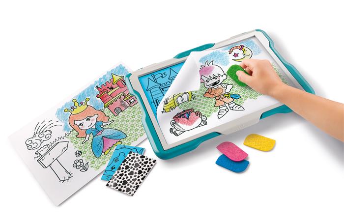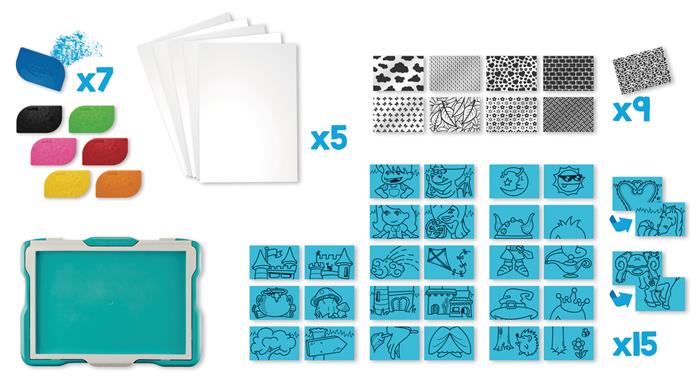 Vidám és eredeti rajztábla, mesés alkotásokhoz, sokféle kombinációval. Dörzsöld át a körvonalat, színezd a mintát és kész!