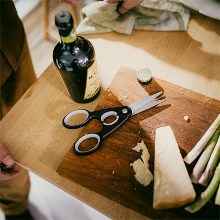 Ez a Fiskars konyhai olló meg fog lepni funkcionalitásával és éles pengéivel. Kiváló minőségű acélból készült, és nem tartalmaz nikkelt.