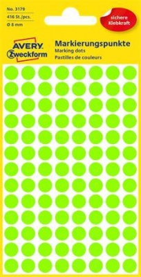 KezdőlapIrodaszerekIrodai papíráruEtikettekEtikett, 8 mm, kör, AVERY ZWECKFORM, neon zöld, 416 etikett/csomag