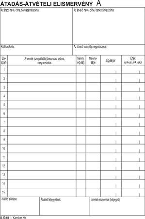 KezdőlapIrodaszerekIrodai papíráruNyomtatványokNyomtatvány, átadás-átvételi elismervény, 25x3, A5, VICTORIA PAPER "B.13-69", 10 tömb/csomag