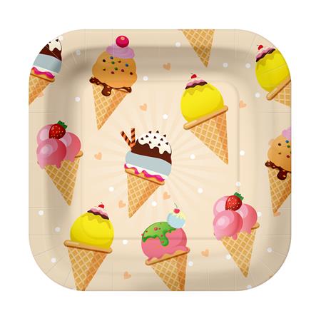 Kerti partikhoz, sütögetős bulikhoz, születésnapokhoz ajánljuk ezt a színes fagyi mintás tányért, amelyet kiegészíthetsz hozzá illő szalvéta és pohár együttesével.