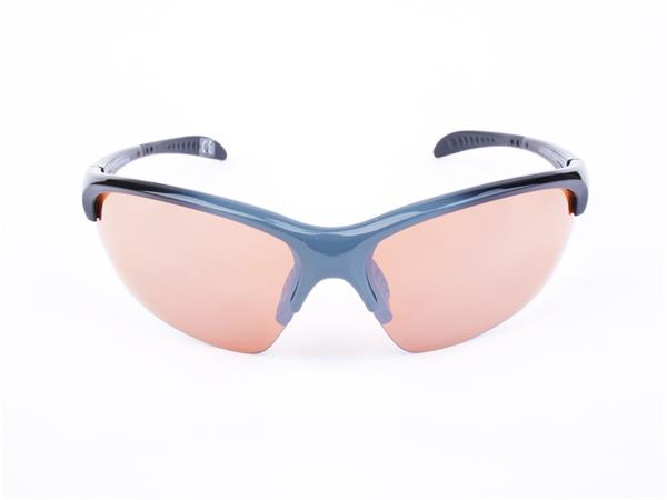 Sportnapszemüveg borostyánszínű HD lencsével, fekete-szürke műanyag kerettel.