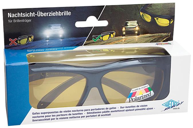 WEDO Wraparound szemüveg a szemüveget viselők által is használható, készült nehéz időjárási körülmények közötti vezetéshez, valamint éjszaka és ködben, esőben és homályos fényviszonyok között. A polarizáló lencsék csökkentik a villogó fényszórók csillogását és nedves utakon a tükröződést. Felhős és ködös időjárási körülmények között a kontrasztos látást is javítják.